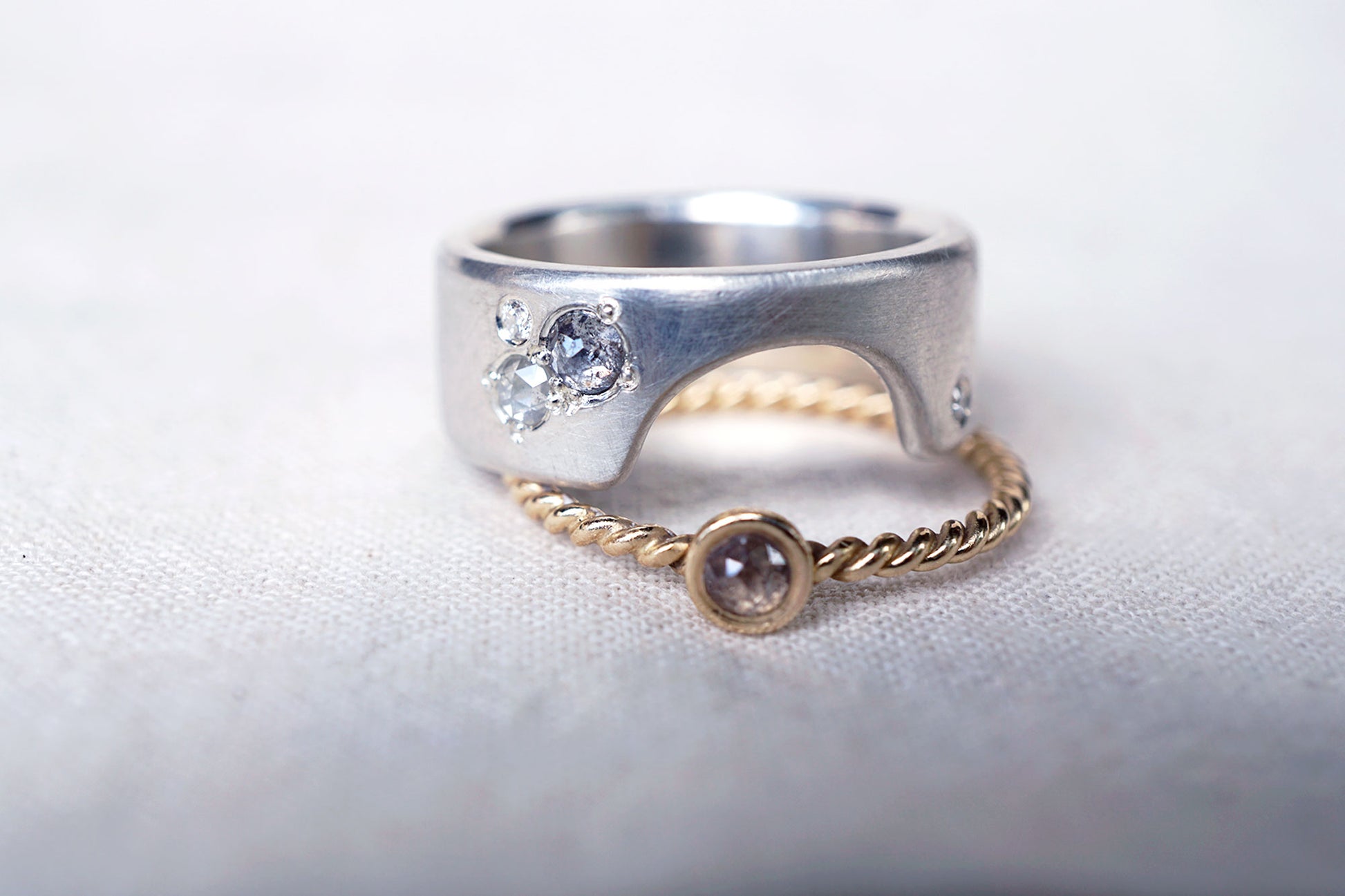 Stones: Natural 3.5 mm salt & pepper rose cut diamond + 2.5mm rose cut ice diamond; two 1.5mm white lab grown diamond accents