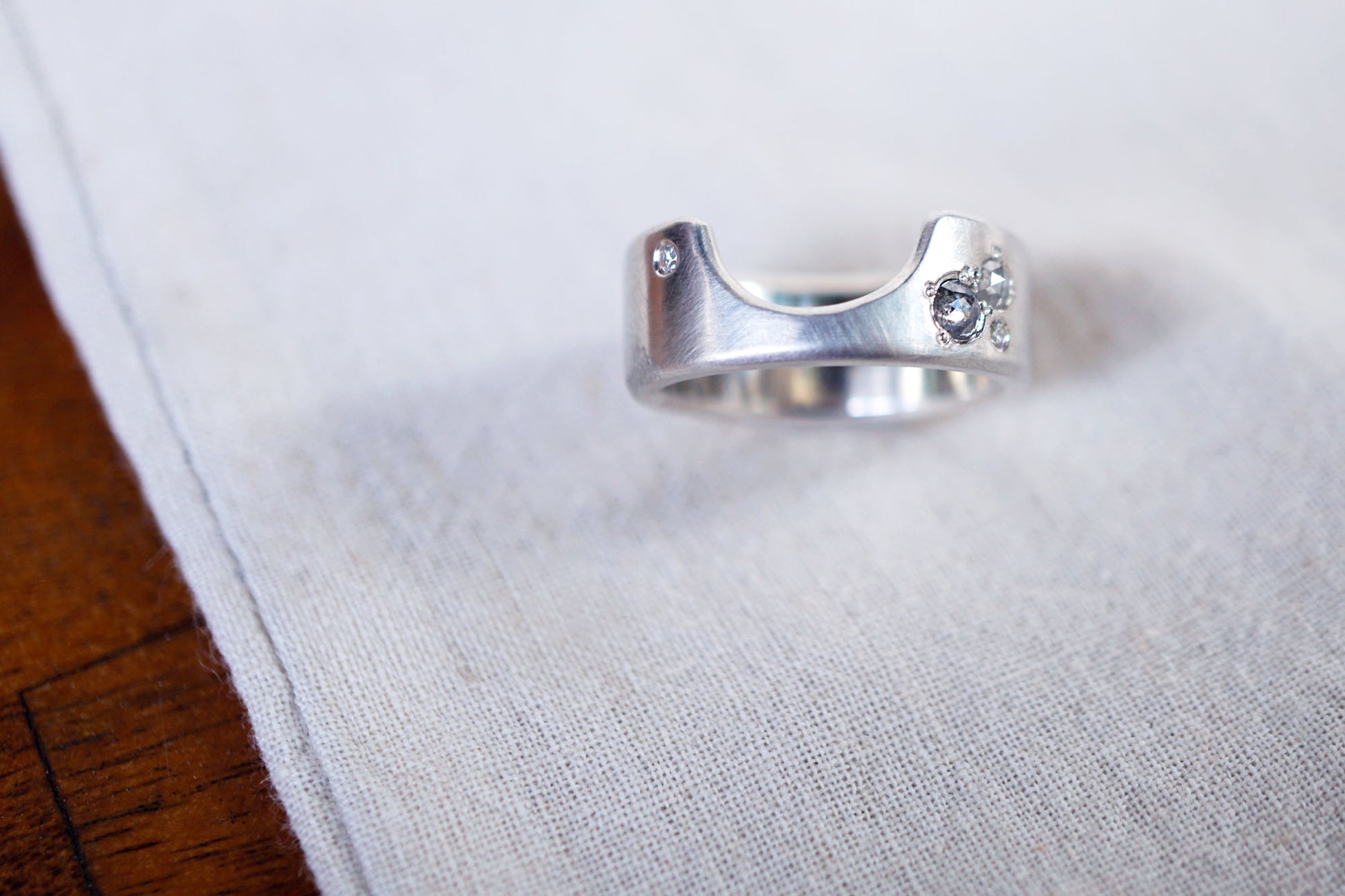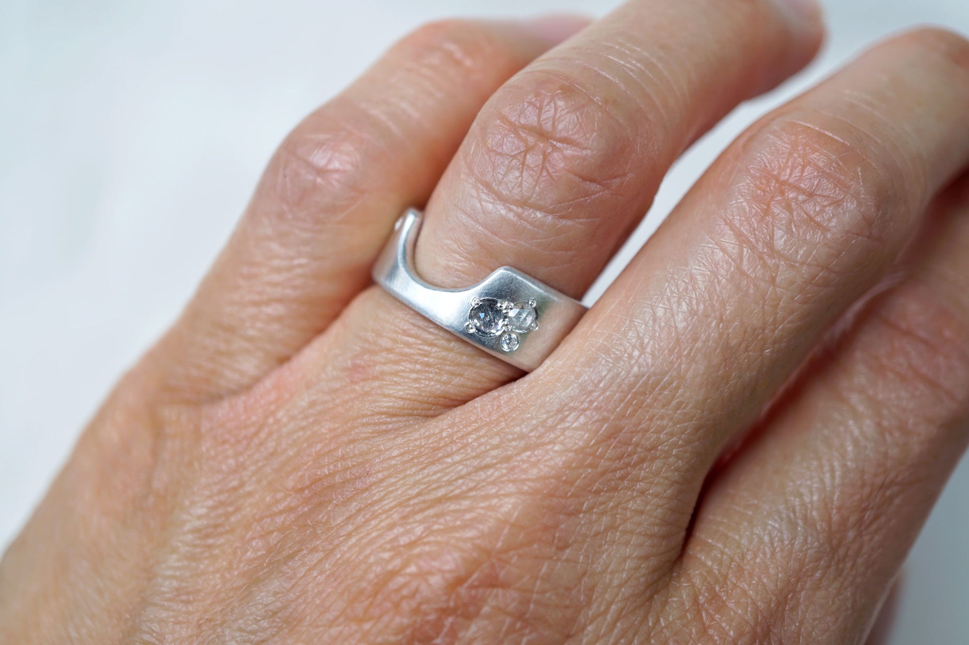 I had so much fun coming up with this modern and elegant ring. Hand fabricated from sterling silver, it features two rose cut diamonds and is accented with two faceted white diamonds. This ring is made of 2mm thick silver and has a nice heft to it.